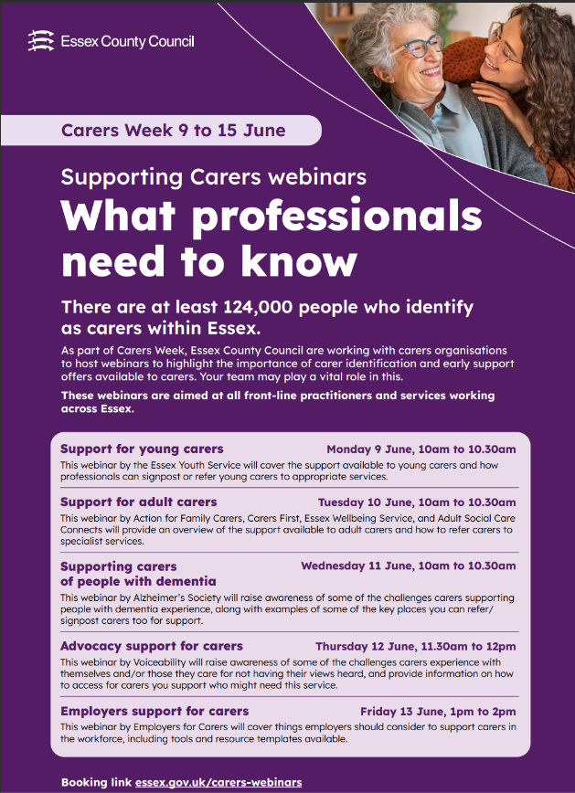 For Carers Week (9 – 15th June), Essex County Council are hosting webinars each day, to highlight the importance of carer identification and the support available to carers.