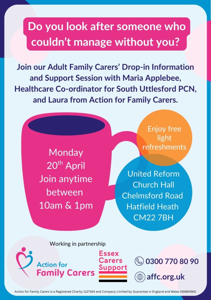 Adult Family Carers Drop-In Information & Support Session – with Maria Applebee, Healthcare Coordinator for South Uttlesford PCN and Laura from our Adult Carer Support Team.