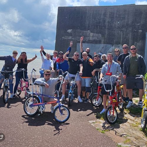 "Group of Action for Family Carers supporters smiling and waving while posing with bicycles by the seaside during a charity bike ride on a sunny day."
